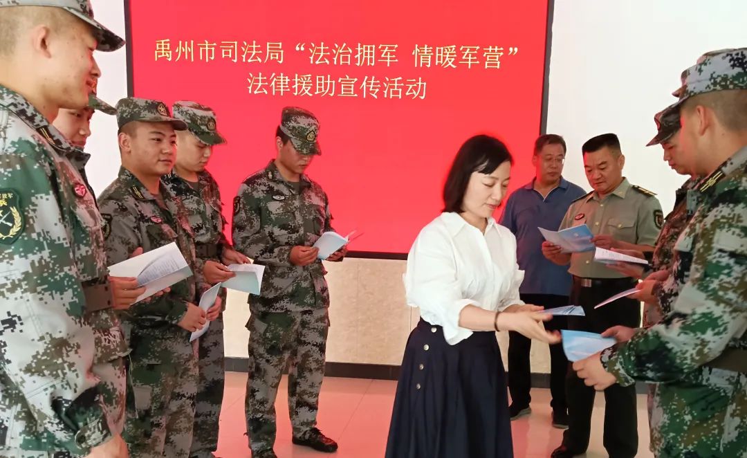 为庆祝“八一”建军节的到来,进一步提高部队官兵的法治素养,7月24日上午,禹州市司法局组织法律援助工作者到禹州市人民武装部开展“法治拥军 情暖军营”活动,将法律援助知识、法律咨询服务送到官兵的身边。