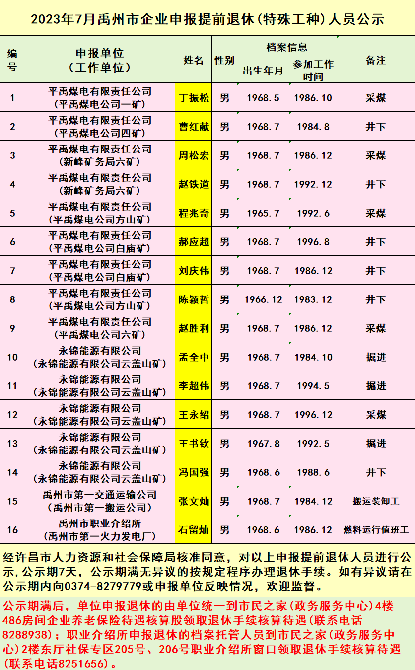 2023年7月禹州市企业申报提前退休(特殊工种)人员公示