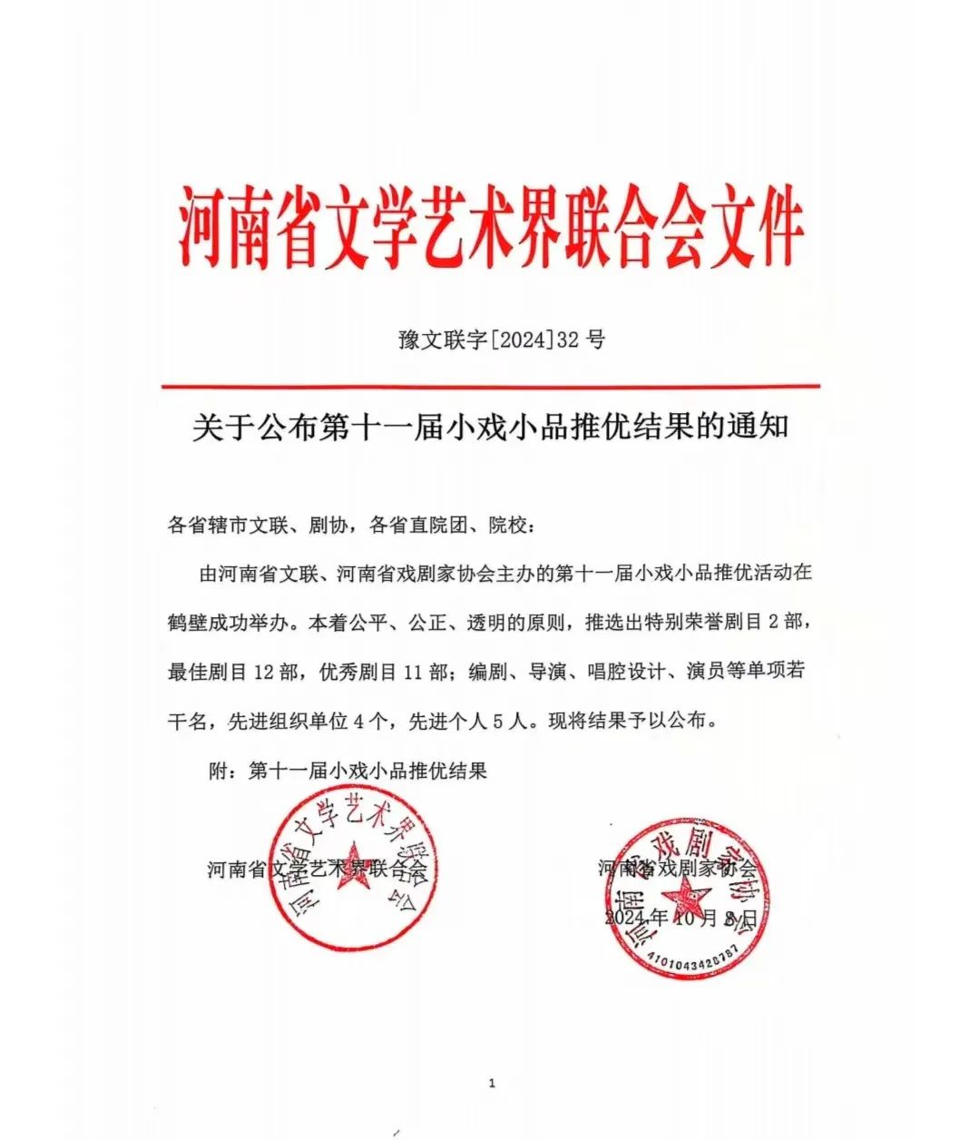 近日,由河南省文联、河南省戏剧家协会主办的“河南省第十一届小戏小品推优大赛”评奖结果公布,禹州市豫剧团原创戏剧小品《何老满相亲》荣获最佳剧目奖、最佳编剧奖、最佳演员奖、优秀演员奖!