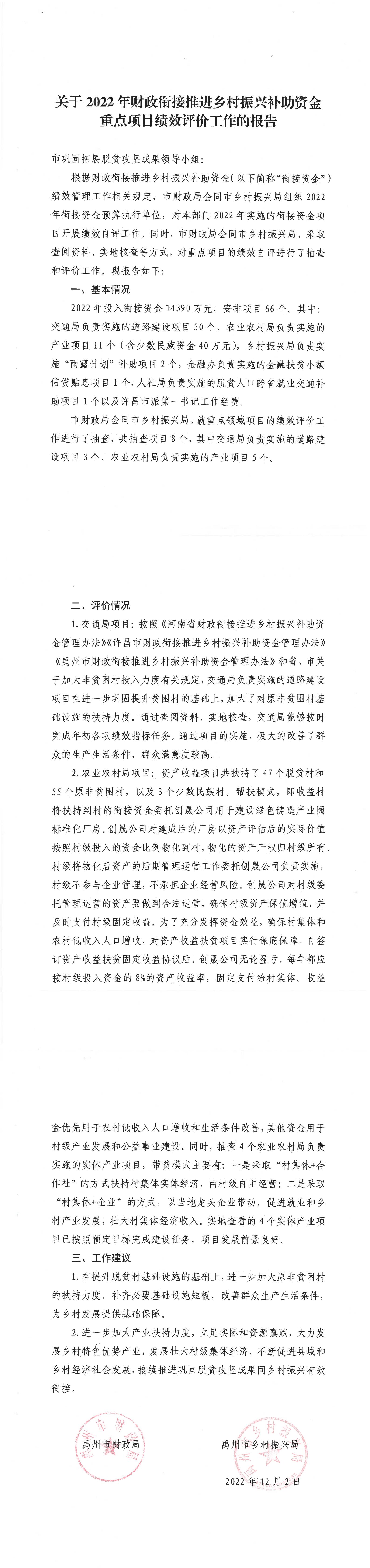 关于2022年财政衔接推进乡村振兴补助资金重点项目绩效评价工作的报告