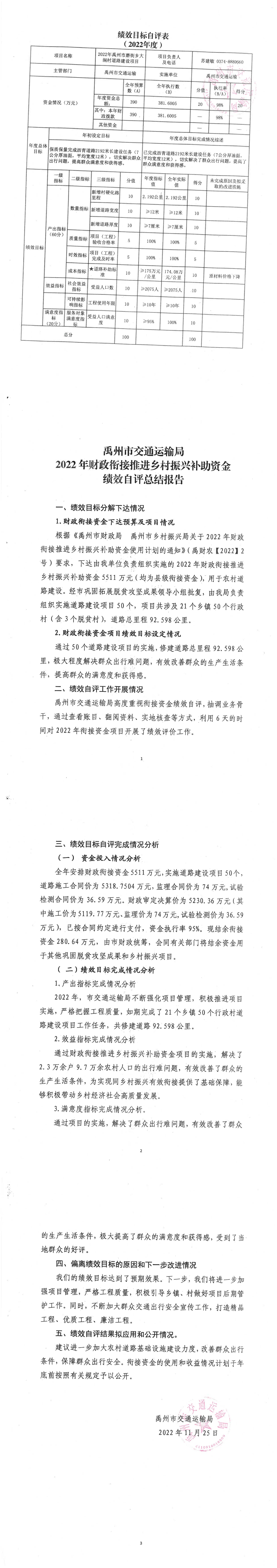2022年禹州市磨街乡大涧村道路建设项目绩效自评结果及交通局2022年财政衔接资金绩效自评总结报告