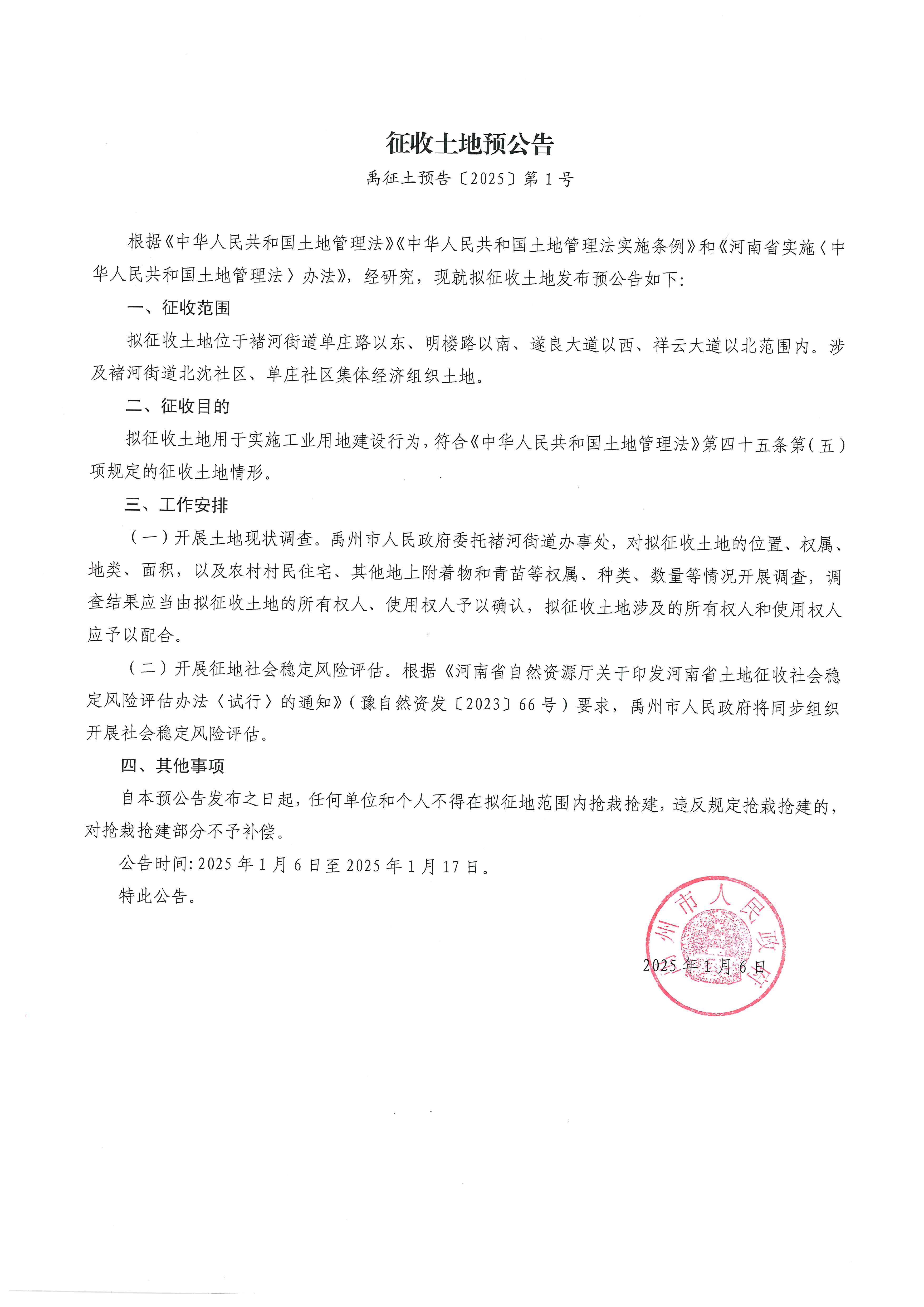禹州市征收土地预公告