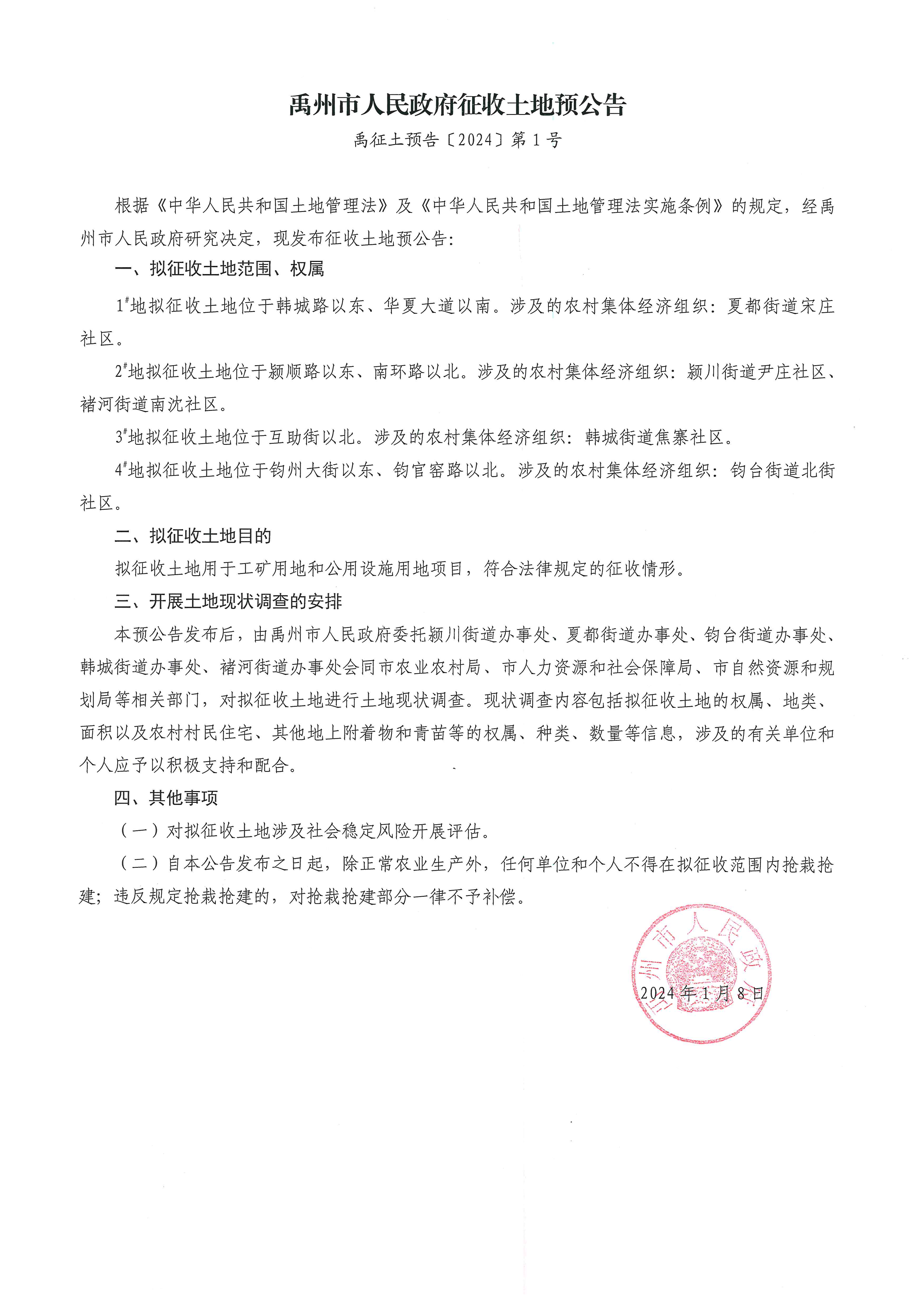 禹州市人民政府征收土地预公告