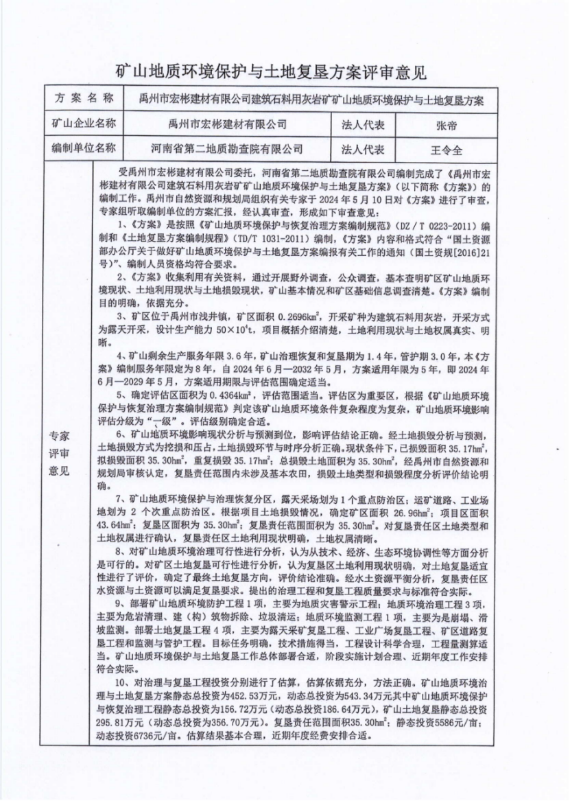 根据国土资规【2016】21号《国土资源部办公厅关于做好矿山地质环境保护与土地复垦方案编报有关工作的通知》文件精神,我局现对《禹州市隆锦矿业有限公司建筑石料用灰岩矿、禹州市宏彬建材有限公司筑石料用灰岩矿矿山地质环境保护与土地复垦方案》专家评审意见(见附件)进行公示,公示期7天,自发布之日至2024年7月8日。