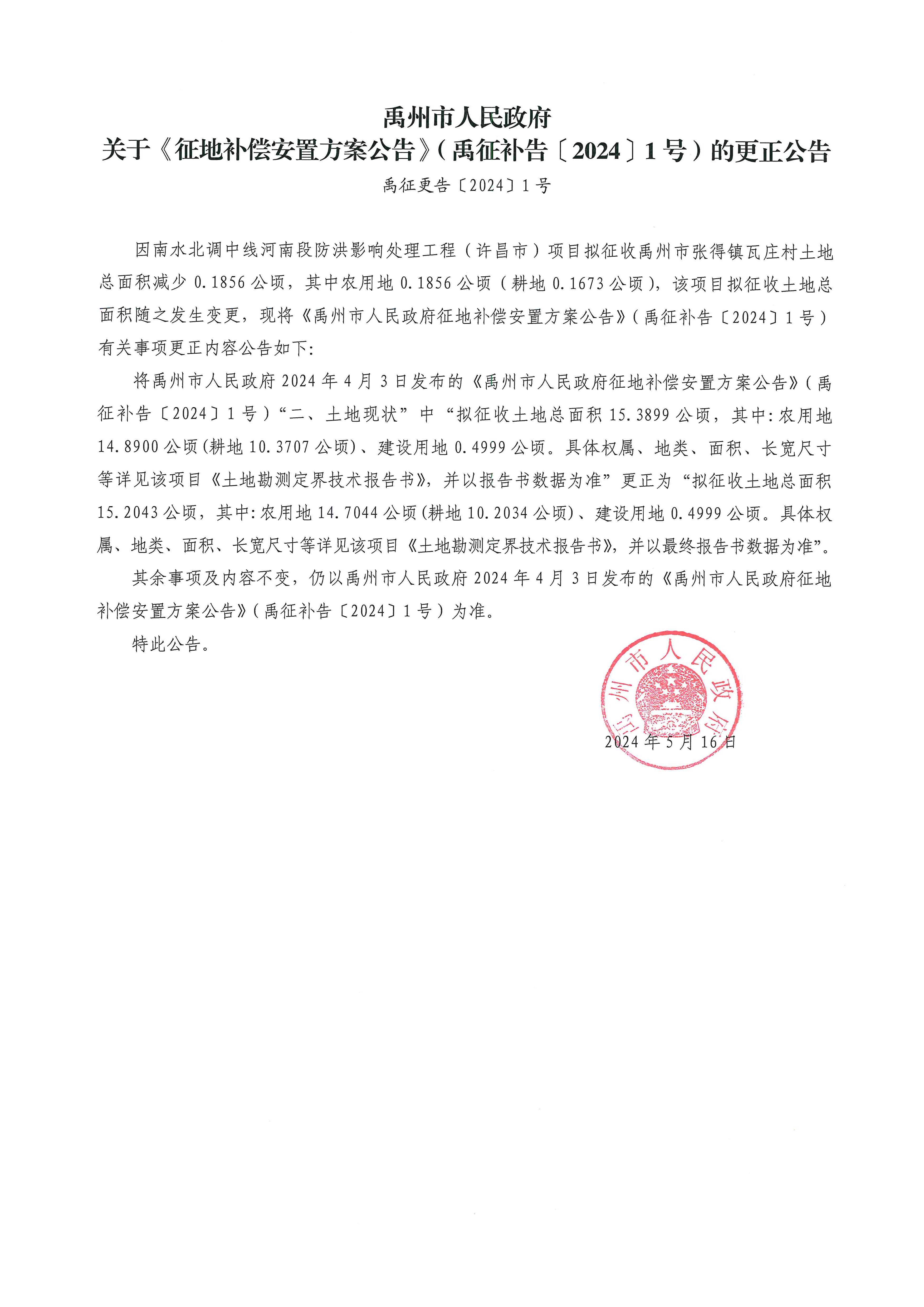 禹州市人民政府关于《征地补偿安置方案公告》(禹征补告〔2024〕1号)的更正公告