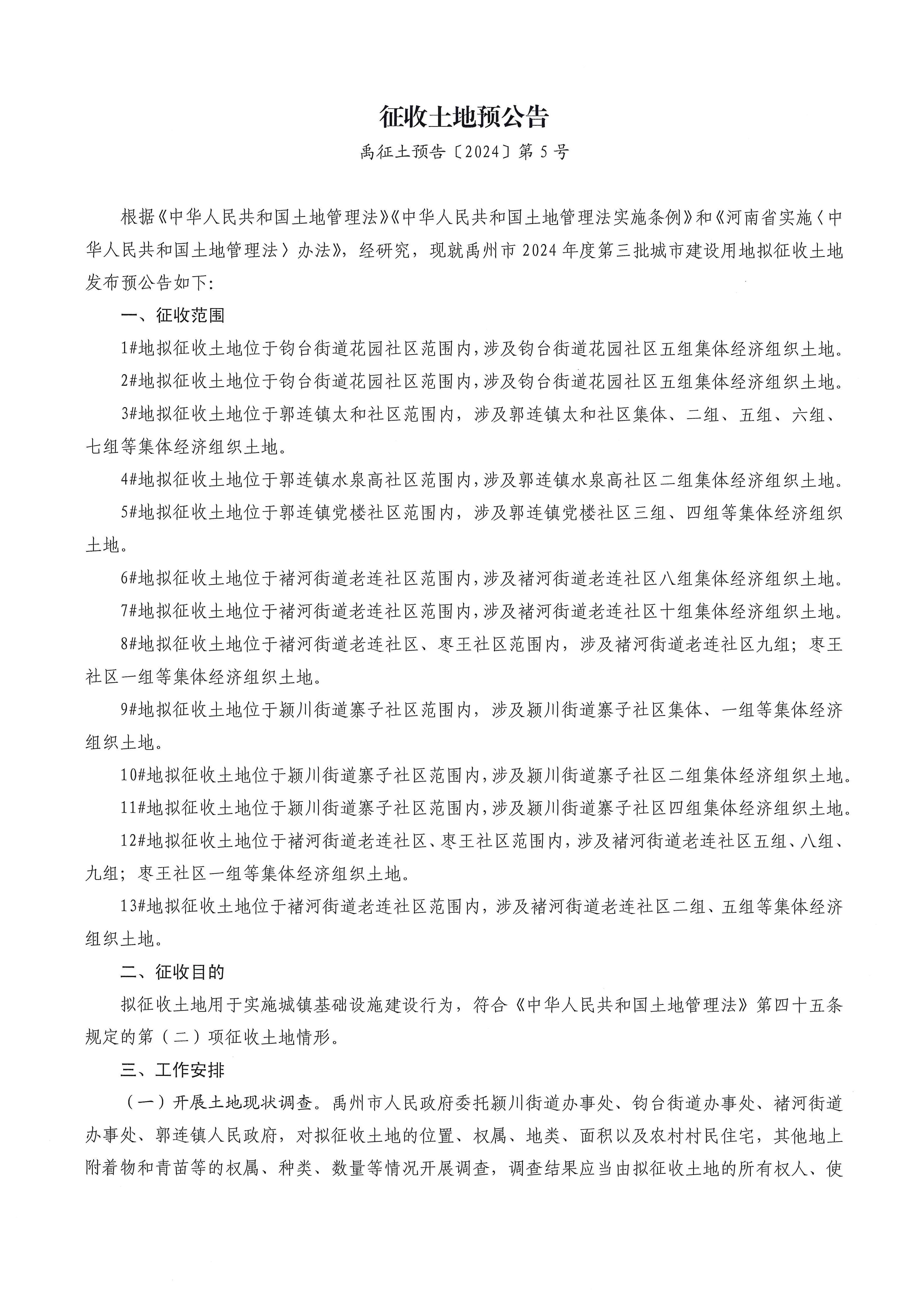 禹州市2024年度第三批城市建设用地征收土地预公告