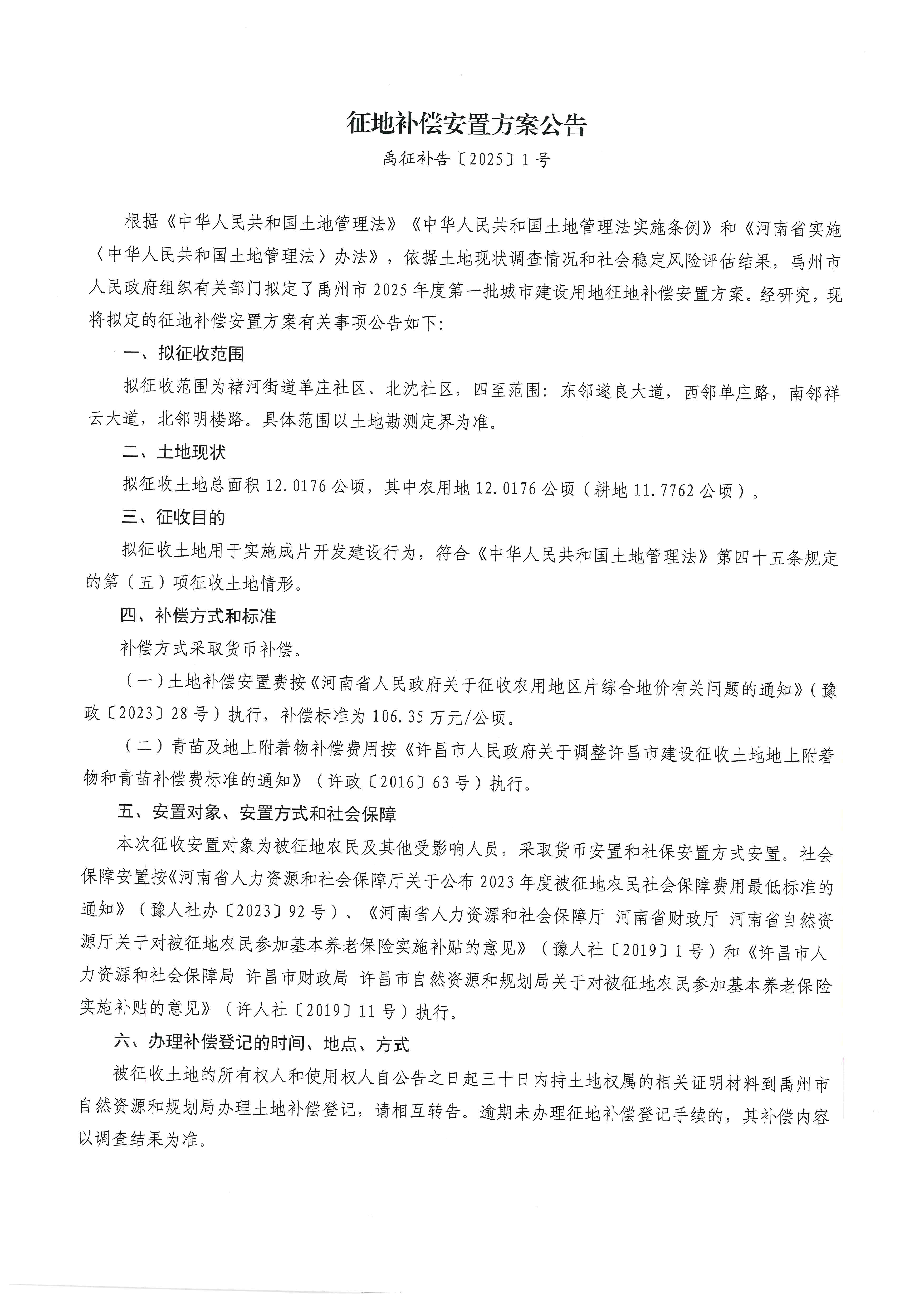 禹州市征地补偿安置方案公告