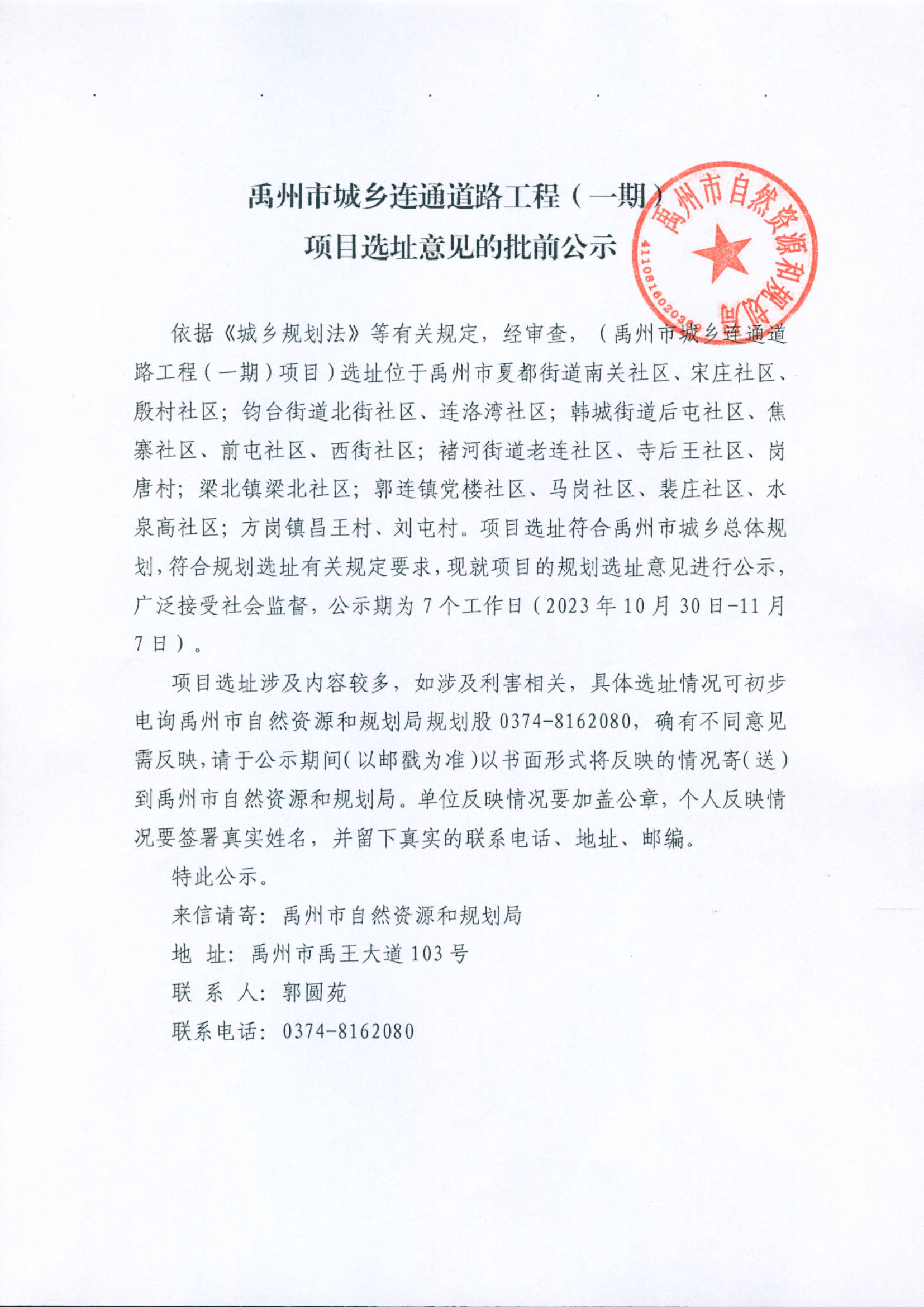 禹州市城乡连通道路工程(一期)项目选址意见的批前公示