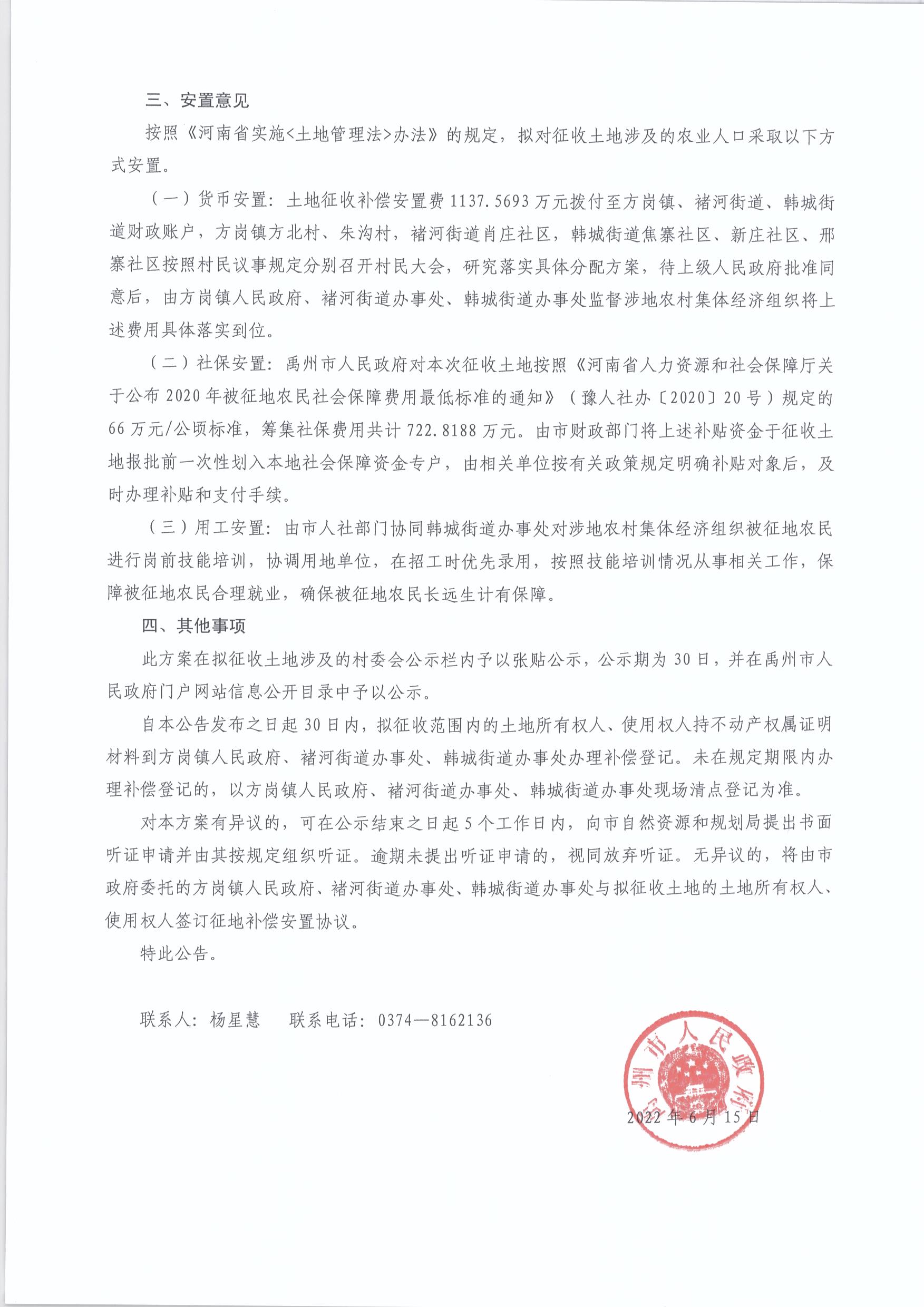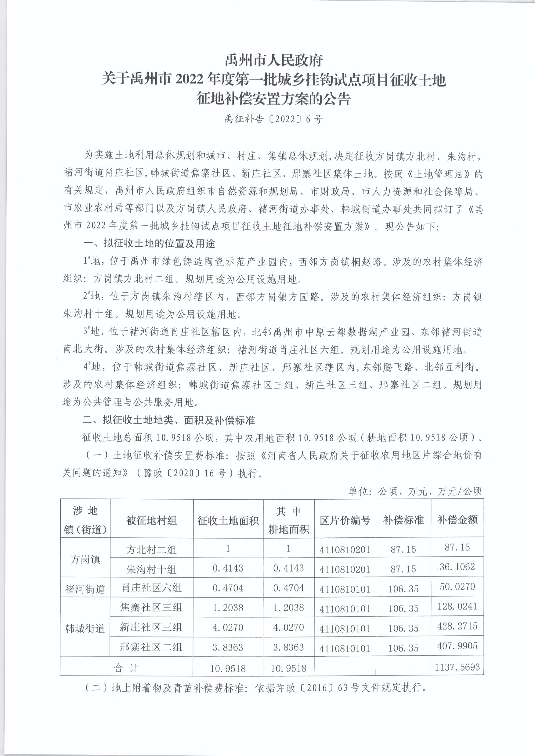 禹州市人民政府关于禹州市2022年度第一批城乡挂钩试点项目征收土地征地补偿安置方案的公告