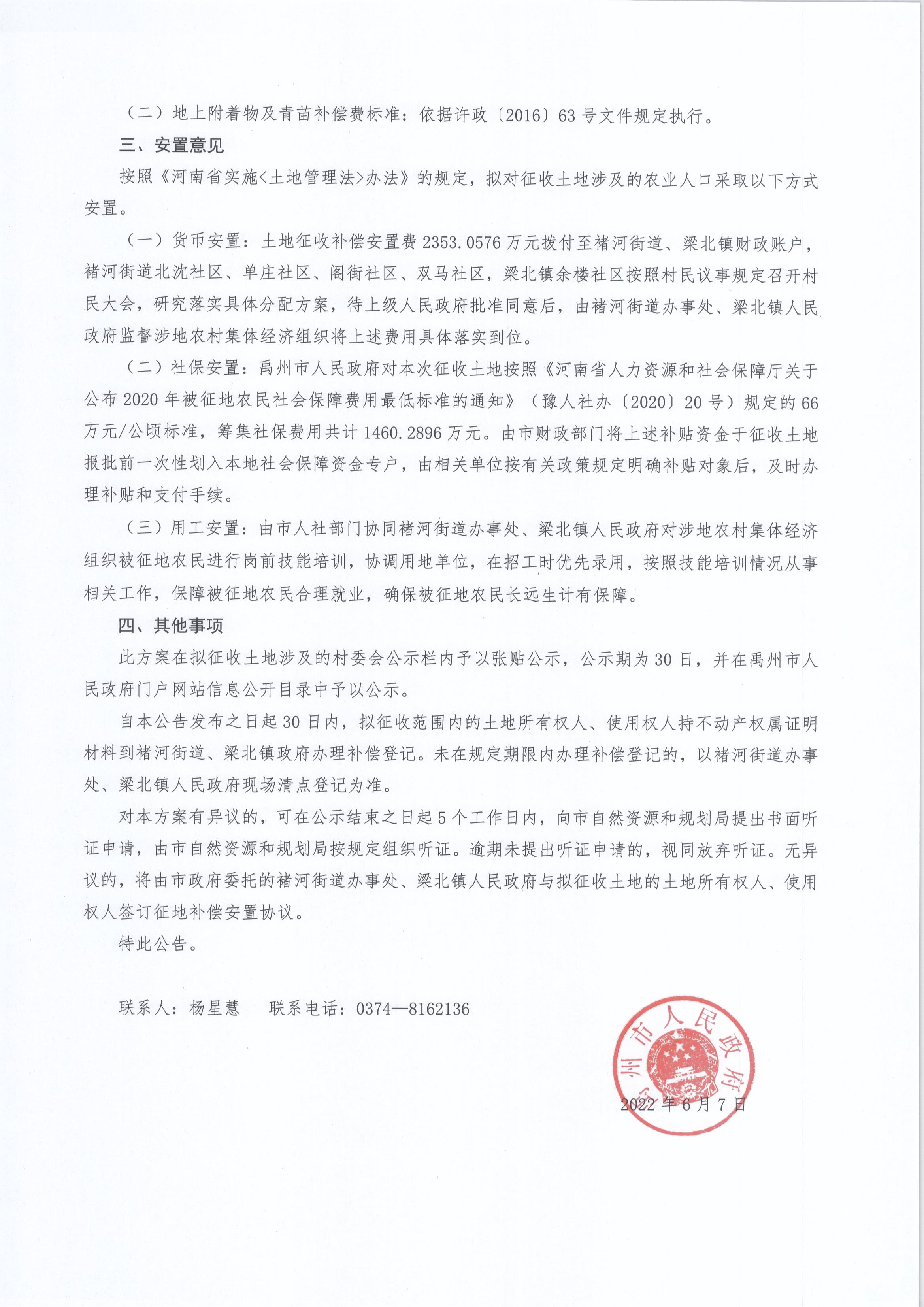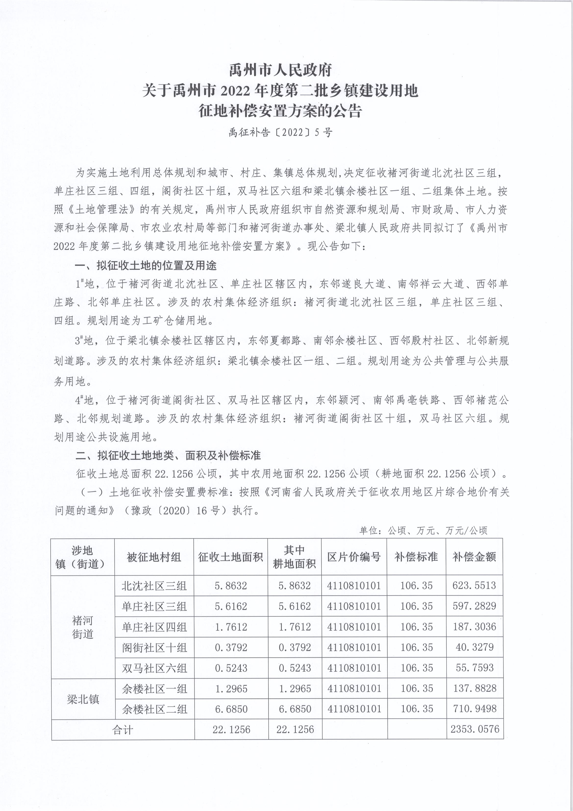 禹州市人民政府关于禹州市2022年度第二批乡镇建设用地征地补偿安置方案的公告