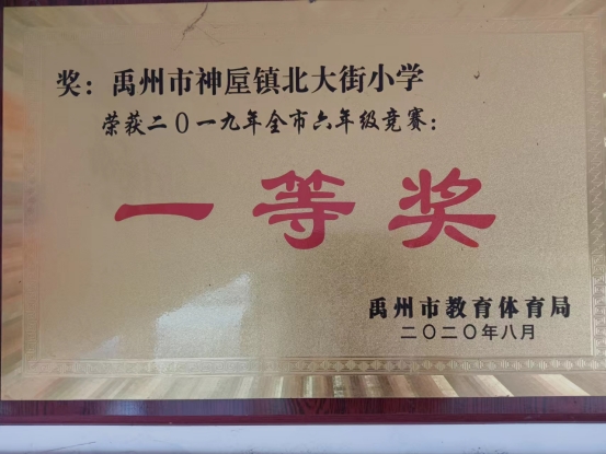 在2019年6月禹州市教体局组织的六年级三科联赛中,我校荣获全市一等奖的佳绩。