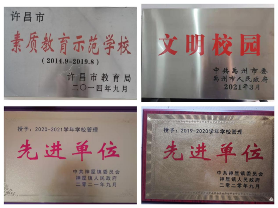 我校也于2014年9月获得许昌市素质教育示范学校荣誉称号、2021年3月获得禹州市文明校园荣誉称号、连年获得神垕镇教育总支颁发的先进单位荣誉称号。