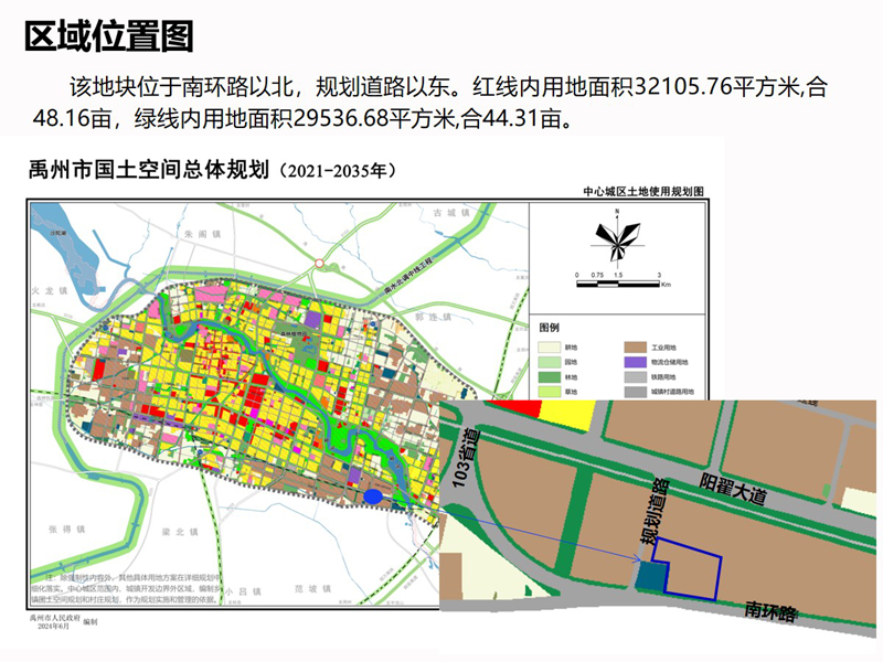 该地块位于南环路以北,规划道路以东。红线内用地面积32105.76平方米,合48.16亩,绿线内用地面积29536.68平方米,合44.31亩。于2025年09月26日经中共禹州市委国土空间规划委员会2025年第六次会议审议通过。